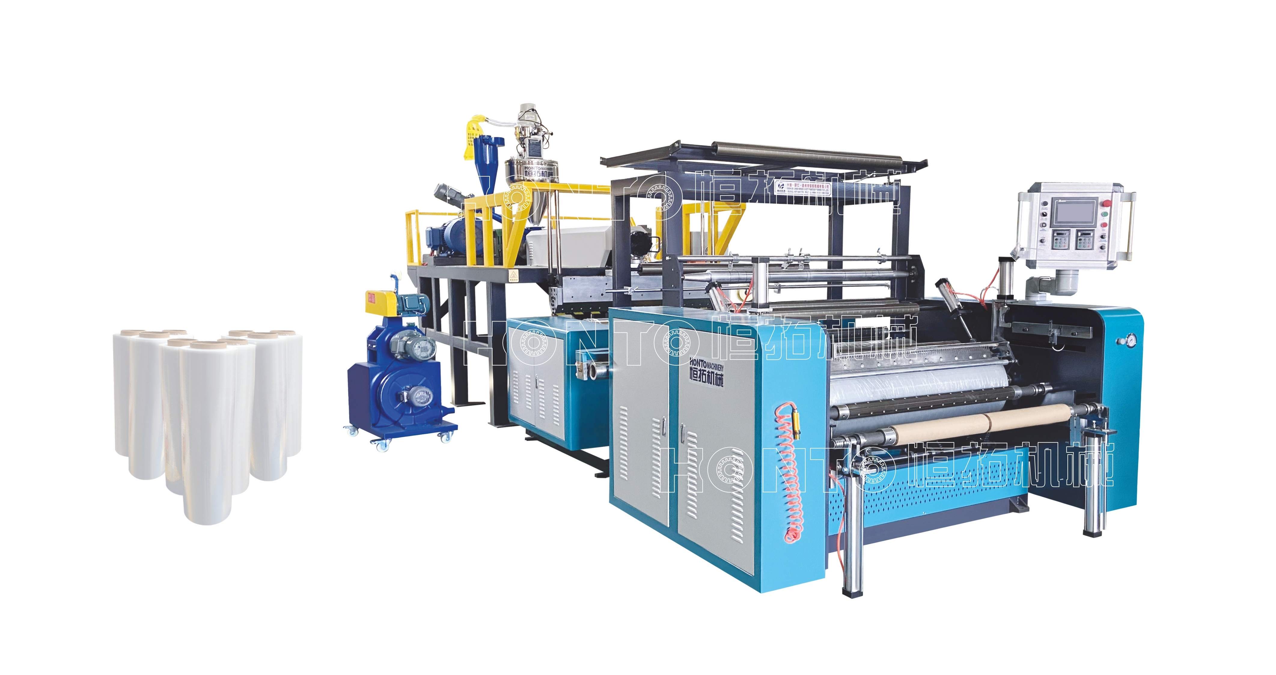 2. O dispositivo de resfriamento adota um ciclo de resfriamento de água que fornece o melhor efeito transparente do filme stretch 3. O rebobinador adota um tipo de rebobinamento por fricção, com dispositivo de corte para correção de borda.